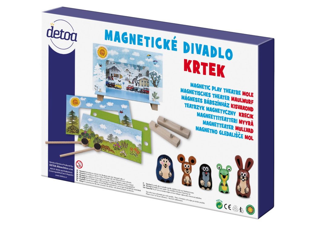 Magnetické divadlo Krteček a jeho kamarádi je výborná zábava pro malé i velké. Ve figurkách je vlepený magnet který se přitahuje k magnetu ve vodítku. Hra rozvíjí dětskou fantazii a kreativitu při vymýšlení vlastních pohádkových příběhů. Výrobek splňuje požadavky EU na bezpečnost hraček a je vhodný pro děti od 3 let. Baleno v papírové krabici o rozměrech 330x230x35 mm. © Zdeněk Miler