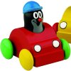 Krtek v jezdícím autíčku. Při zmáčknutí krtka se ozve zapískání. Baleno po 4 kusech v krabici z tvrdého papíru - 3 ks červených a 1 ks žluté autíčko, nebo samostatně. Výrobek splňuje požadavky EU na bezpečnost hraček a je vhodný pro děti od 1 roku. Rozměry krabičky jsou 160 x 160 x 75 mm. © Zdeněk Miler